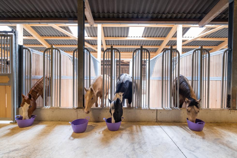 Das Kraftfutter wird den Boxenpferden in stabilen Krippen aus schlagfestem Kunststoff offeriert. Jede Boxe verfügt über eine Tränke, die mit einem Ventil mit Durchflussmengenregulierung ausgestattet ist, sodass die Pferde jederzeit einfach und ohne viele irritierende Spritzer zu Frischwasser kommen.
