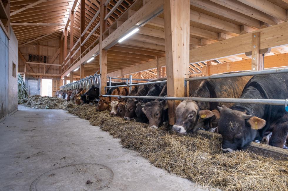 Wunderschön oberhalb des Dorfes Sarn gelegen: dieser neu gebaute Mastviehstall. Wir durften neben den Nackenrohren für die Futterachse, Abtrennungen, Tränketröge und ein Stangentor liefern.