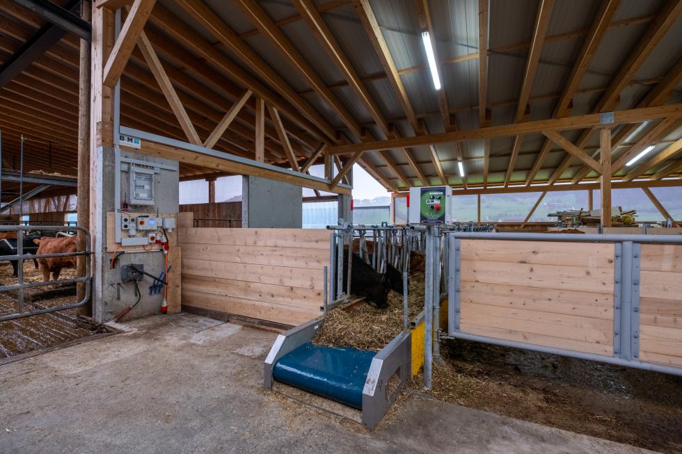 Damit Platz gespart werden konnte, wurde hier ein 9 Meter langes Futterband zwischen zwei Gruppen eingebaut. So konnte die Stallfläche optimal ausgenutzt werden. Das Futterband kann frontal einfach beschickt werden und der gegenseitige Futteransporn verhindert Futterresten auf dem Band.