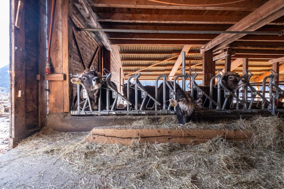 Im idyllischen Lawin wurde ein Stall für Bündner Grauvieh mit dem Fressgitter Rondo SH ausgestattet. Das Rondo SH wurde speziell für behornte Tiere entwickelt. Die Kuh hat oben keinerlei Begrenzung und kann so ungestört ins und aus dem Fressgitter schlüpfen. Die optimierte Zugänglichkeit verbessert die Futteraufnahme und minimiert das Verletzungsrisiko.