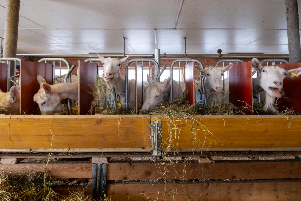 Ein zentraler Punkt dieser Ziegenhaltung ist die Milchgewinnung. Sowohl Planung und als auch Ausführung mussten sorgfältig darauf abgestimmt werden. So sollte sichergestellt werden, dass die Melkprozesse effizient bleiben ohne Kompromisse bei den Hygienestandards zu machen. Die optimale Raumausnutzung im bestehenden Gebäude war die grosse Herausforderung, denn ein separater Melkstand konnte aus Platzgründen nicht in Erwägung gezogen werden. Die Ziegen werden nun an der erhöhten Fressachse gemolken, der eingestreute Bereich darunter wird von den Ziegen gerne als Rückzugsort angenommen. Die so geschaffene Strukturierung der Stalles fördert das Tierwohl und garantiert die Einhaltung der Tierschutzvorschriften.